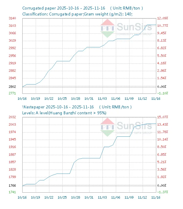 На гофрированную бумагу плотностью 140 г/м² цены выросли на 12,09% в период с 16 октября по 16 ноября 2025 года. За более длительный период (с 27 августа по 25 ноября) совокупный рост составил 20,99%. К 24 ноября последняя цена достигла 3170 юаней за тонну, с небольшими корректировками в сторону повышения.